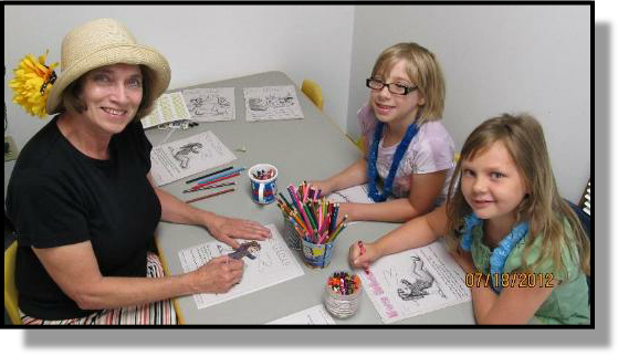 Here I am (Gina} coloring with Melissa and Jaime at the Rock Creek Public Library's summer reading